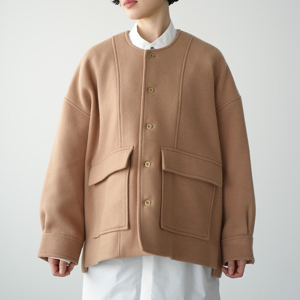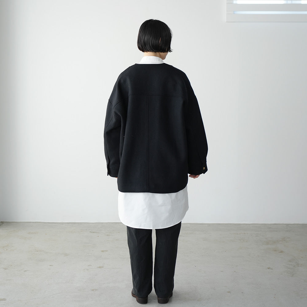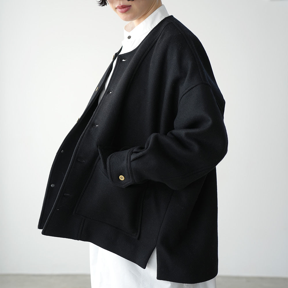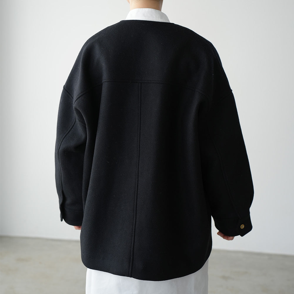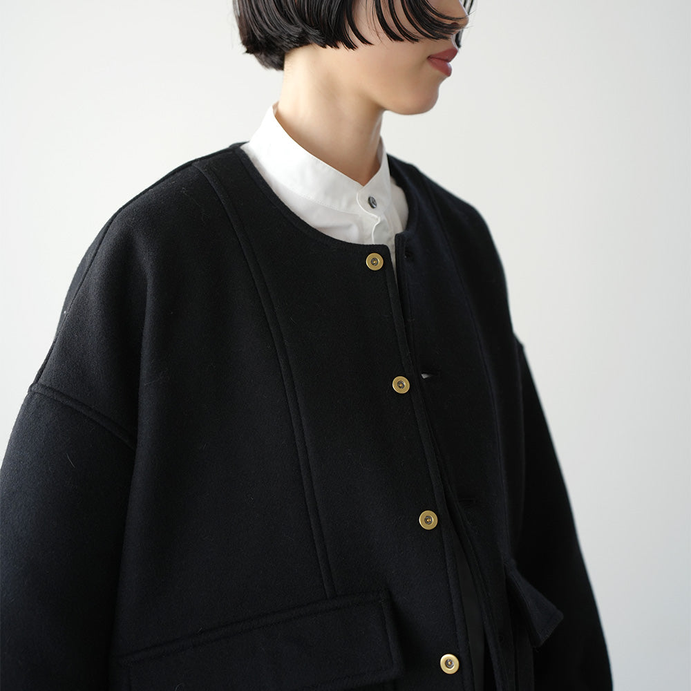 肩はドロップショルダーながら立体仕立てのボックスフォルムで上質な生地ときれいなラインで着ていただけるクルーネックのショートコートです。