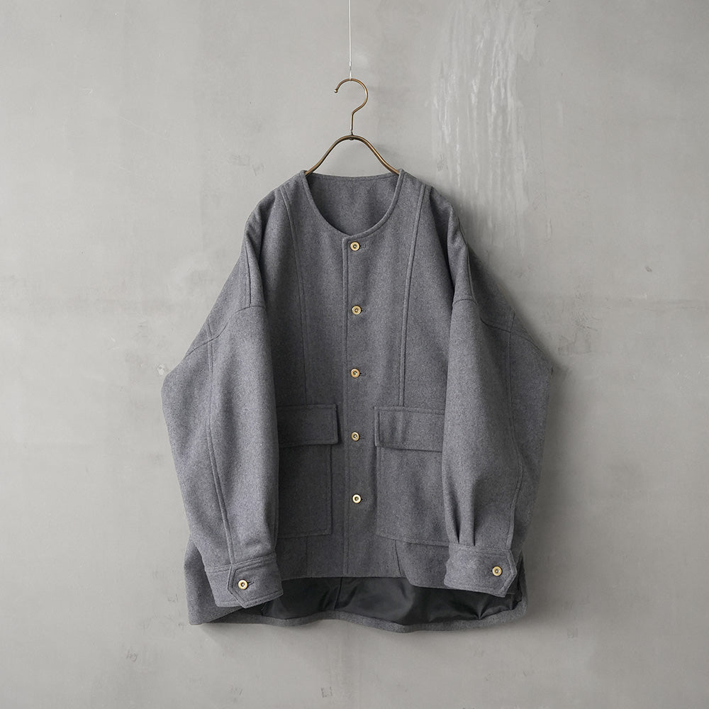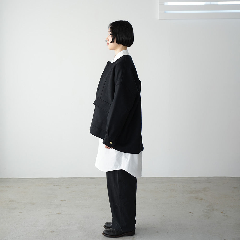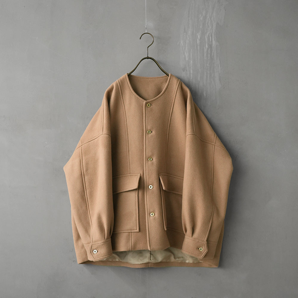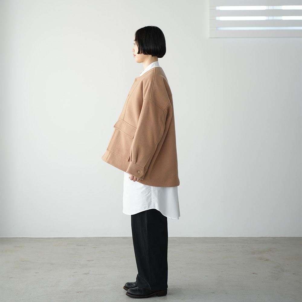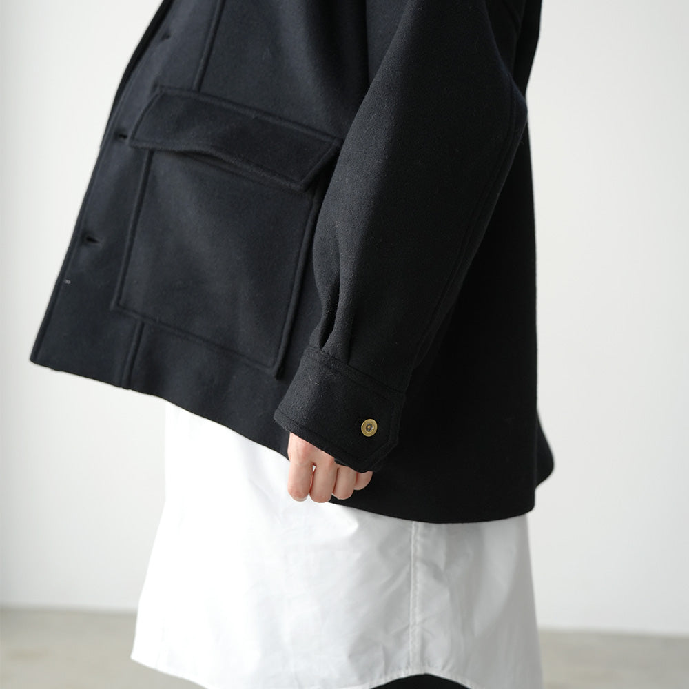 肩はドロップショルダーながら立体仕立てのボックスフォルムで上質な生地ときれいなラインで着ていただけるクルーネックのショートコートです。