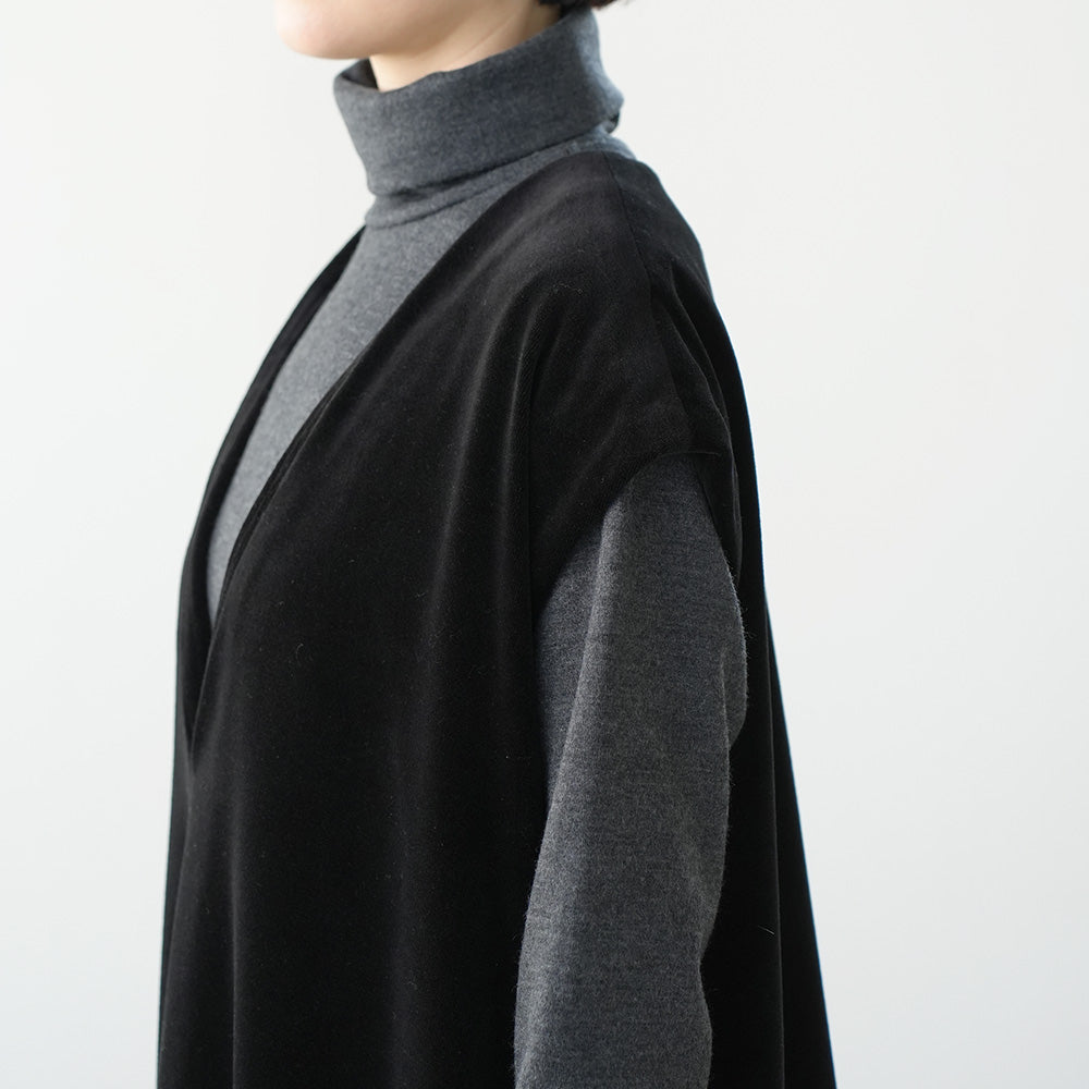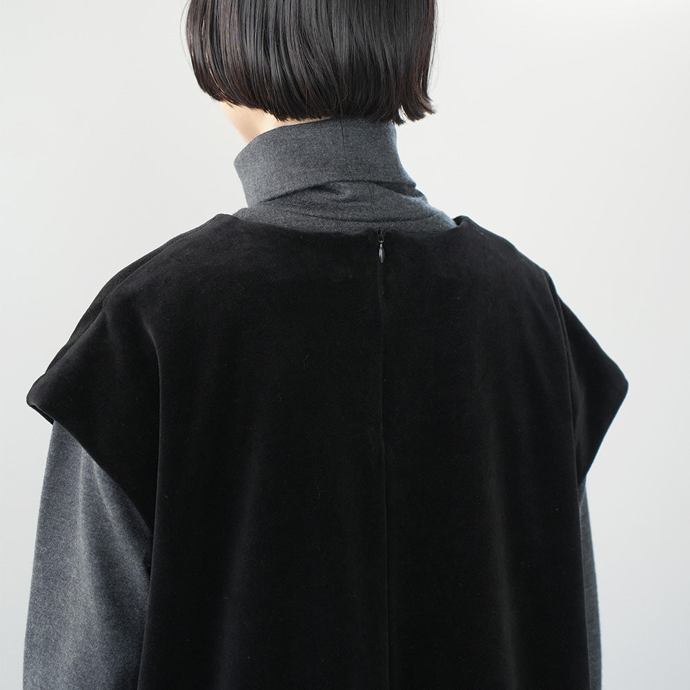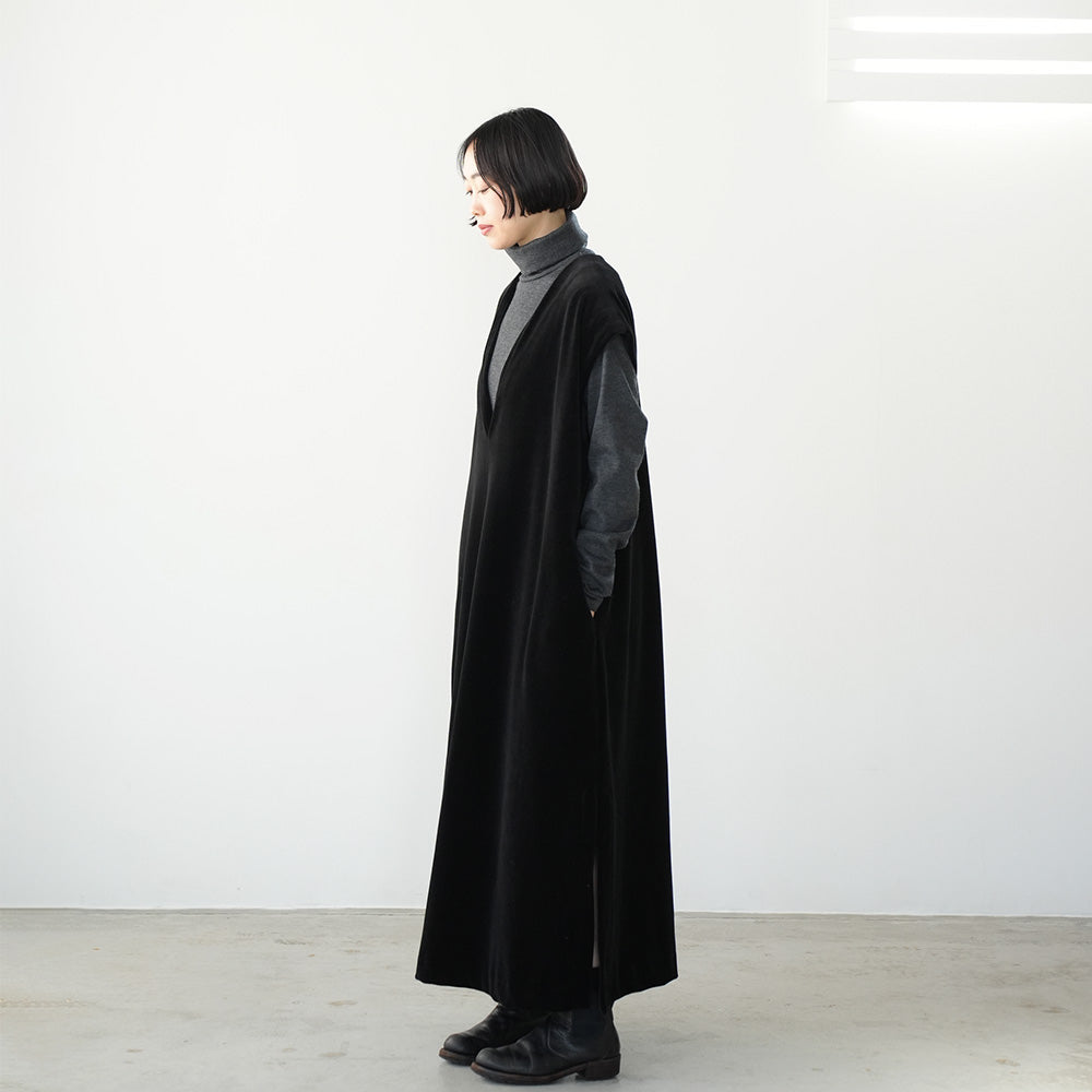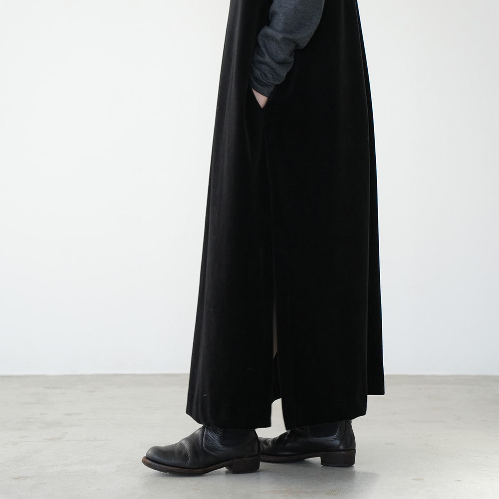 脇にシームポケット、両脇スリットを入れた、動きのあるドレープ感とベロアの光沢が魅力な1枚です。