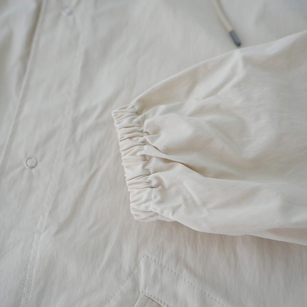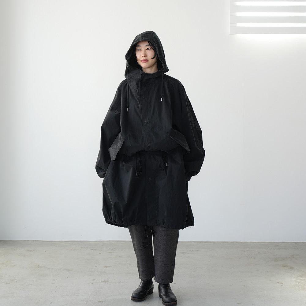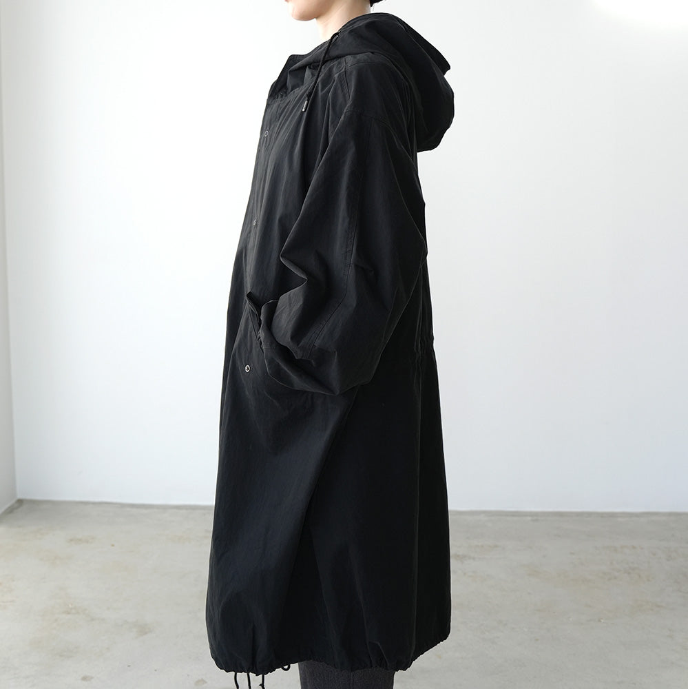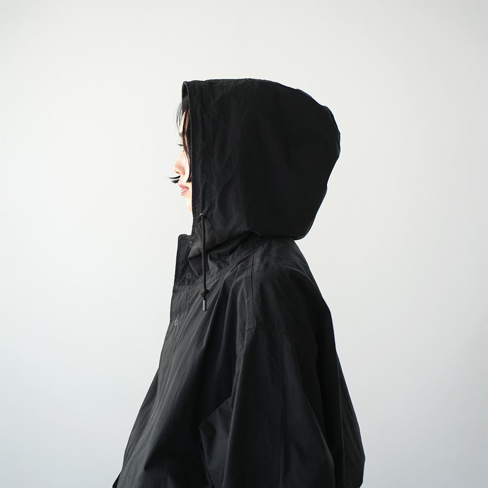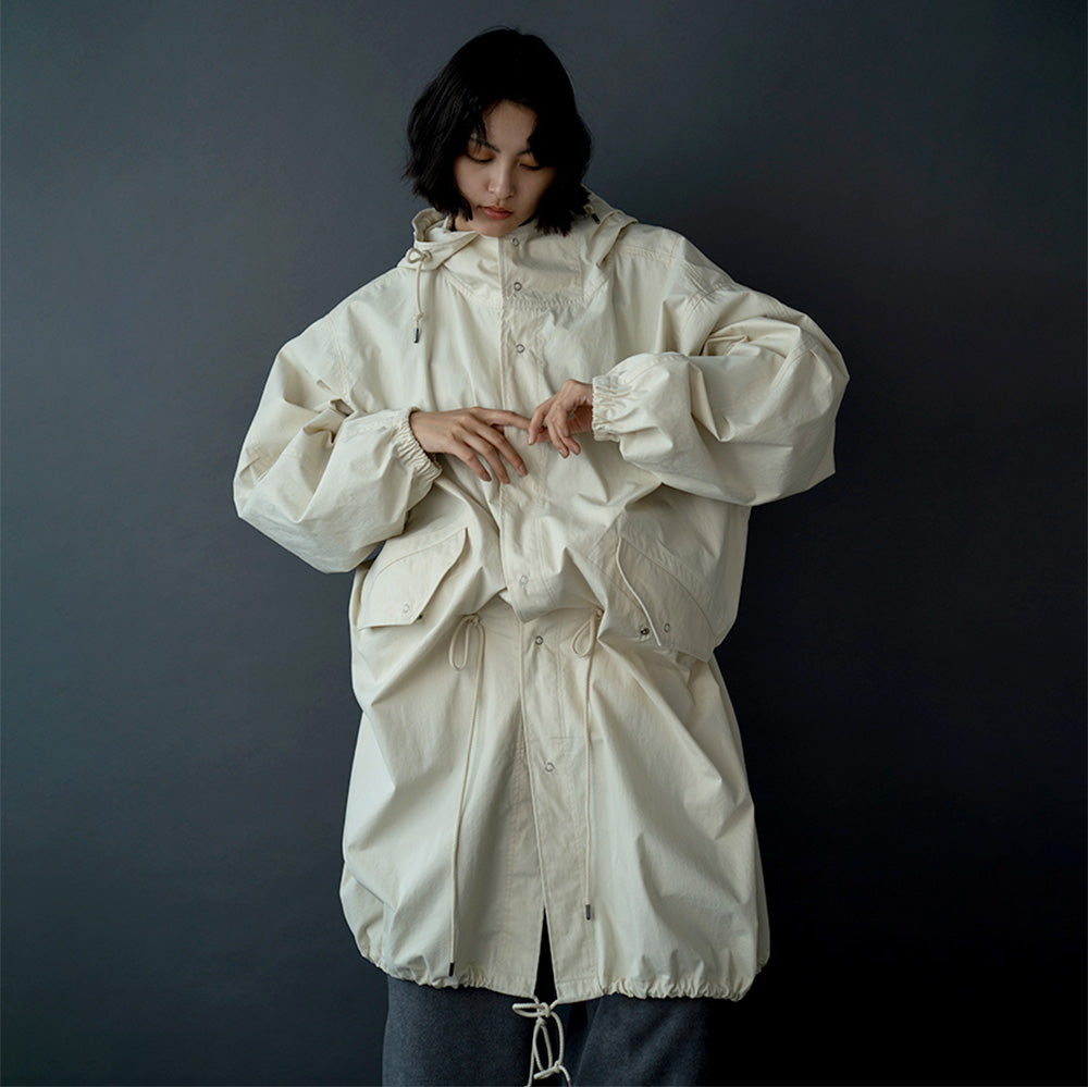 ザックリとしたフードでフロントはドットボタンでフード、裾、ウエストの内側 腰位にドローコードが付き 絞れる仕様に。