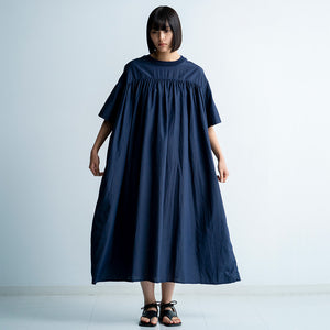 ヨーク下にギャザーをたっぷりと入れてボリュームを出した、1枚でさまになる夏にピッタリの大人マキシ丈の布帛ワンピースです。